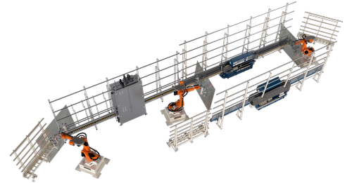Bovone is leading the way in volume glass processing. As an alternative to the conventional glass double edging line, the solution from Bovone is to place two straight line edgers facing each other with a robot placed at each end of the in-feed conveyors to automatically load, turn and unload. Mixed batches of work are loaded onto a trolley, identified with the use of a bar code system. The operator places the loaded trolley in the working zone, exits the area, and then the line controls everything. All the adjustments for grinding, speed, thickness, size and even wheel wear is taken care of by the Bovone automatic system.