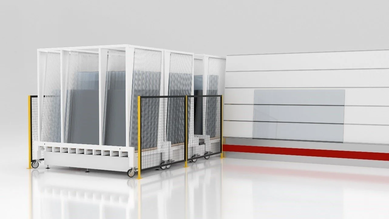 The Automated Harps Rack System is an efficient glass handling solution designed for small to medium glassworks, facilitating loading and unloading of glass sheets on vertical production lines for dimensions up to 3000 x 1500mm. After cutting, operators place glass sheets onto harps in production order, each holding up to 40 sheets. The harp is then loaded onto a modular ground structure that raises and moved it forward, automatically unloading sheets one by one. Once empty, the harp is returned for reloading while other harps continue the process. This system can also operate in reverse for unloading.