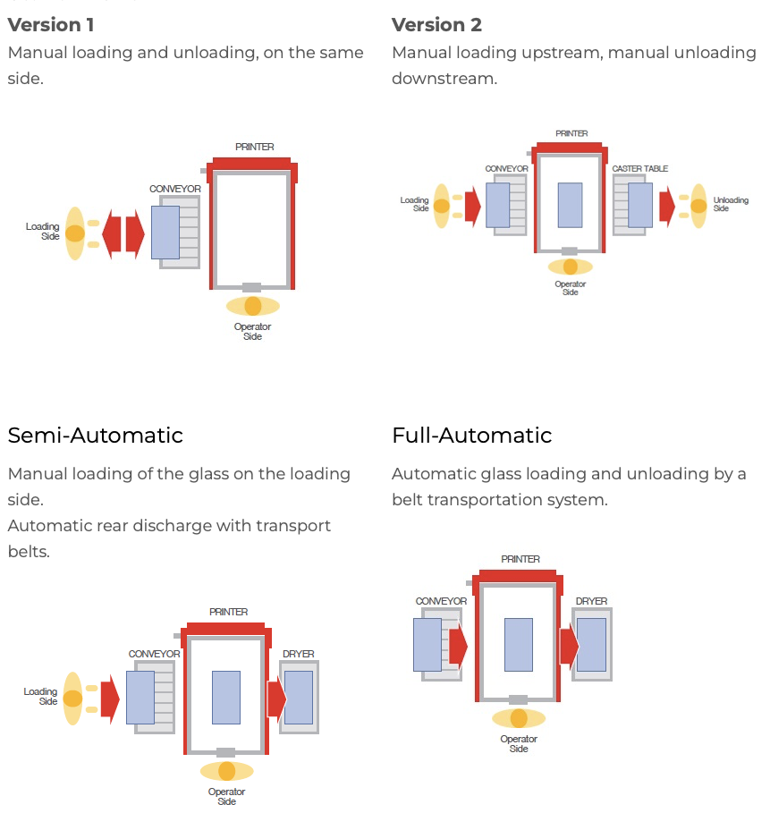 The machine supports rectangular glass sizes from 600x500mm to 2700x1600mm, with an adjustable frame referenced on the left front side. A movable screen enables customised printing on various glass areas. Fully standalone, it is also ready for seamless inline integration.