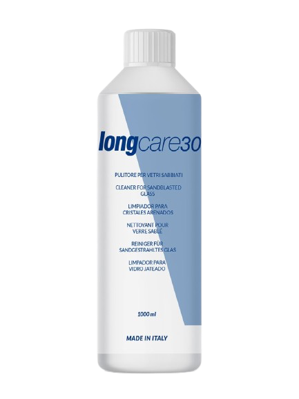 LONGCARE30 IS THE PRODUCT FOR CLEANING AND KEEPING THE WATER-REPELLENT AND ANTI-FINGERPRINT TREATMENT ON SANDBLASTED GLASS UNCHANGED OVER TIME. It is ideal for avoiding cleaning errors on the sandblasted surface.